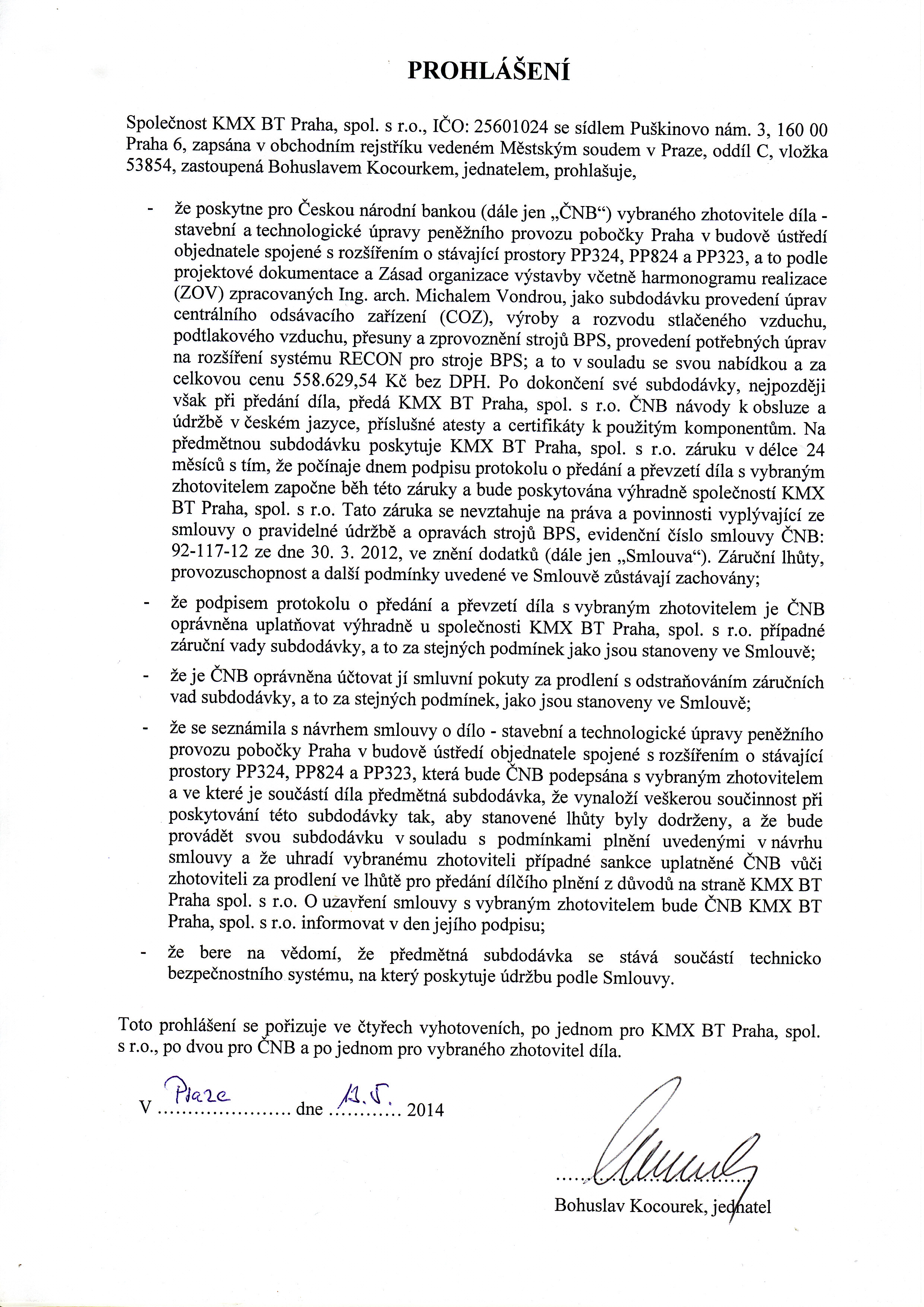 které budou určenými subdodavateli vybraného dodavatele. Závazná cenová nabídka SECURITY TECHNOLOGIES s.r.o. a KMX BT Praha, spol. s r.o. tvoří přílohu č. 3 poptávky. Prohlášení společnosti SECURITY TECHNOLOGIES s.r.o. KMX BT Praha, spol. s r.o. tvoří přílohu č. 4 poptávky.